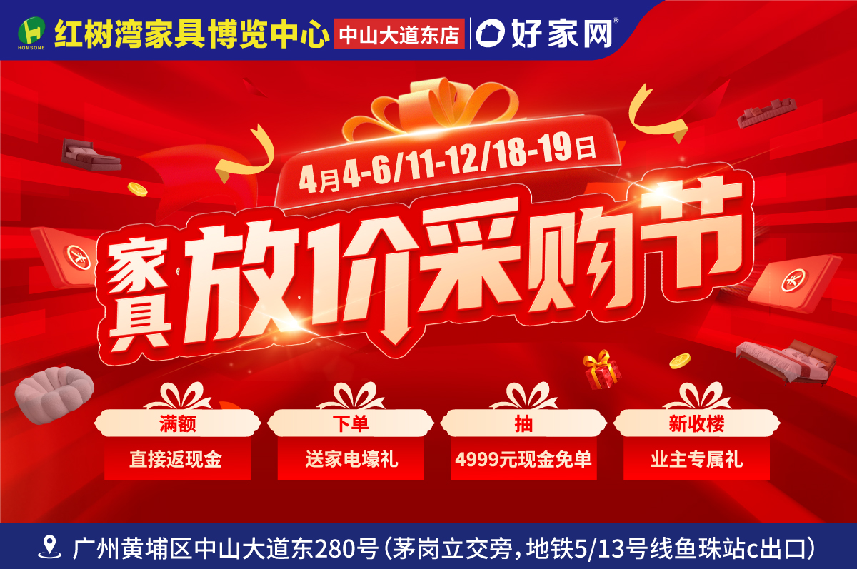 • 4月4-6/11-12/18-19日黄埔红树湾家具博览中心(中山大道东店) 家具放价采购节